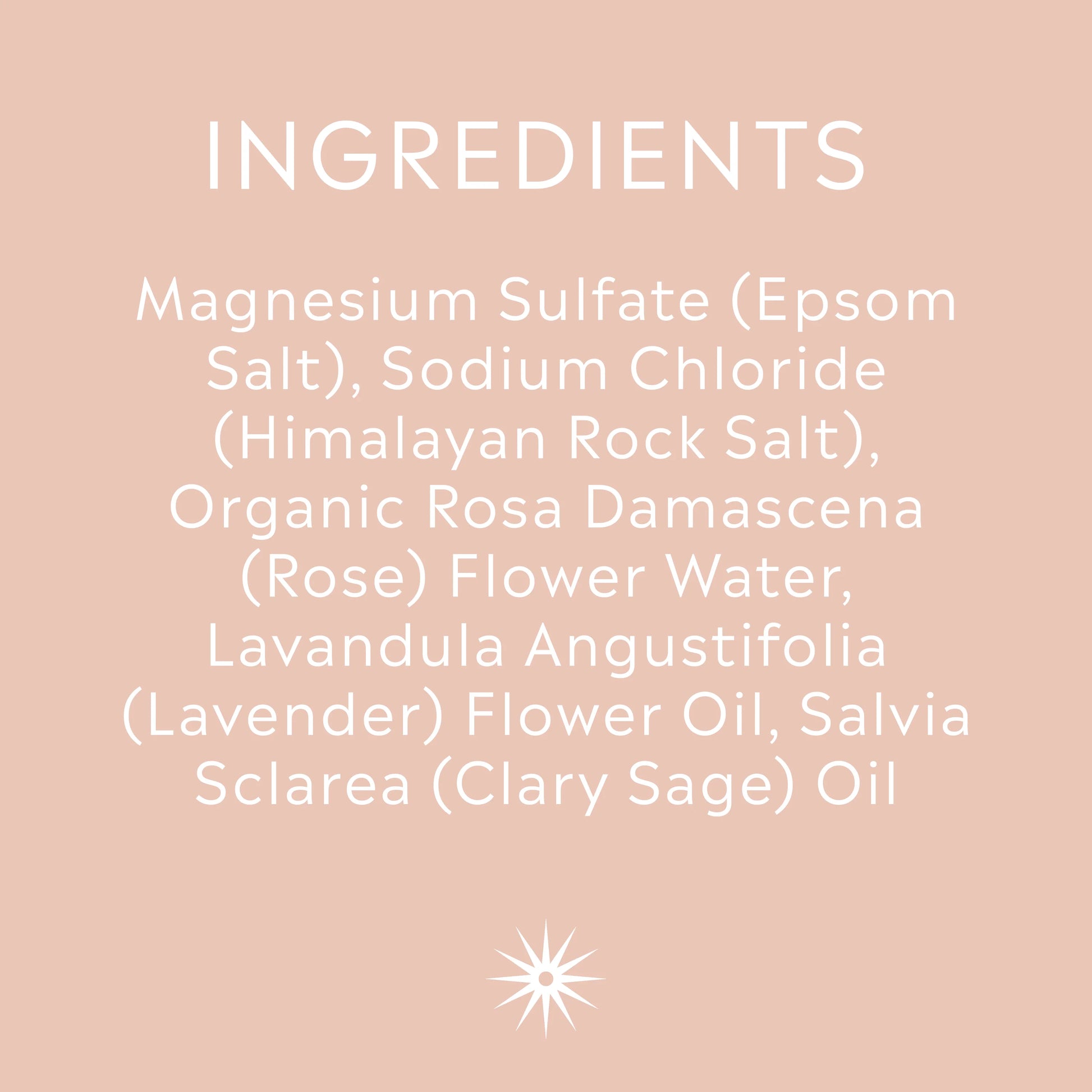 - Ingredients: Magnesium Sulfate (Epsom Salt), Sodium Chloride (Himalayan Rock Salt), Organic Rosa Damascena (Rose) Flower Water, Lavandula Angustifolia (Lavender) Flower Oil, Salvia Sclarea (Clary Sage) Oil.