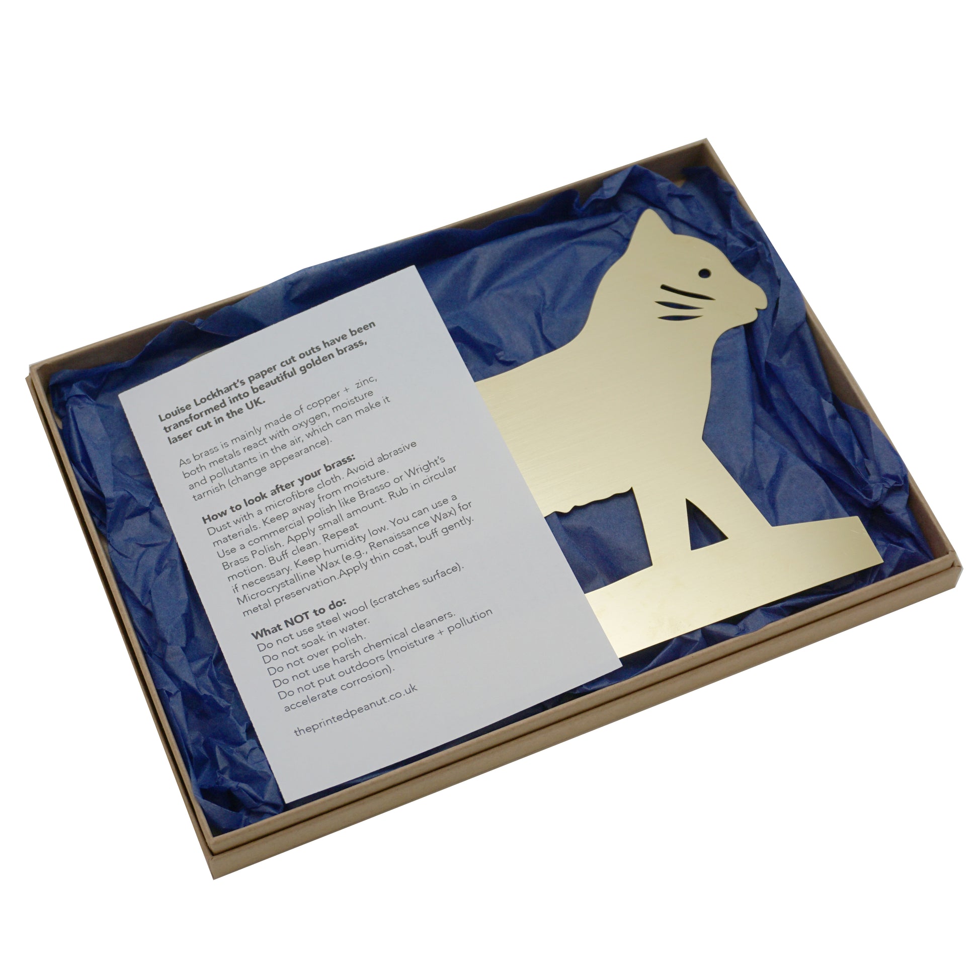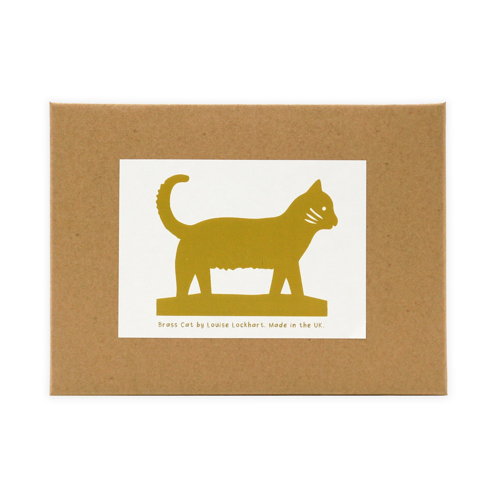 A cut out Brass Cat created by Louise Lockhart for her exhibition Cake Crumbs and Lemonade, held at Yorkshire Sculpture Park. The cat comes complete in a Louise Lockhart branded kraft box.